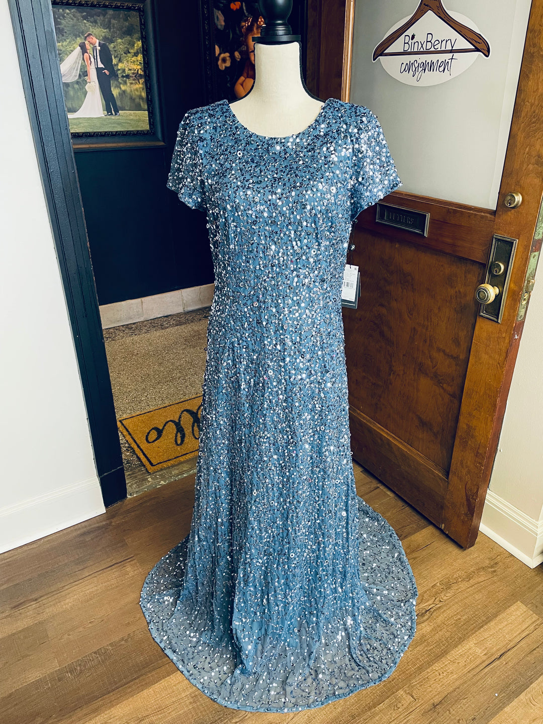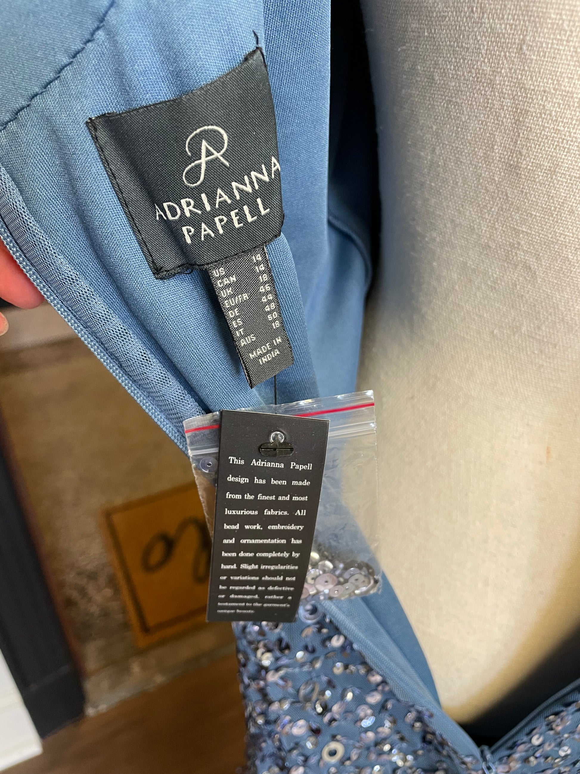 Achieve effortless elegance with the Adrianna Papell scoop back long dress. In a beautiful blue Nile color and gorgeous sequins throughout, this dress is the perfect balance of sophistication and style. Perfect for any formal event. Fully lined with a mesh overlay that has the sequins stitched into it. Swoop train. Zipper closure plus hook & eye clasp in the back. 100% polyester. Brand new, with tags. Women's size 14. A true stunner!