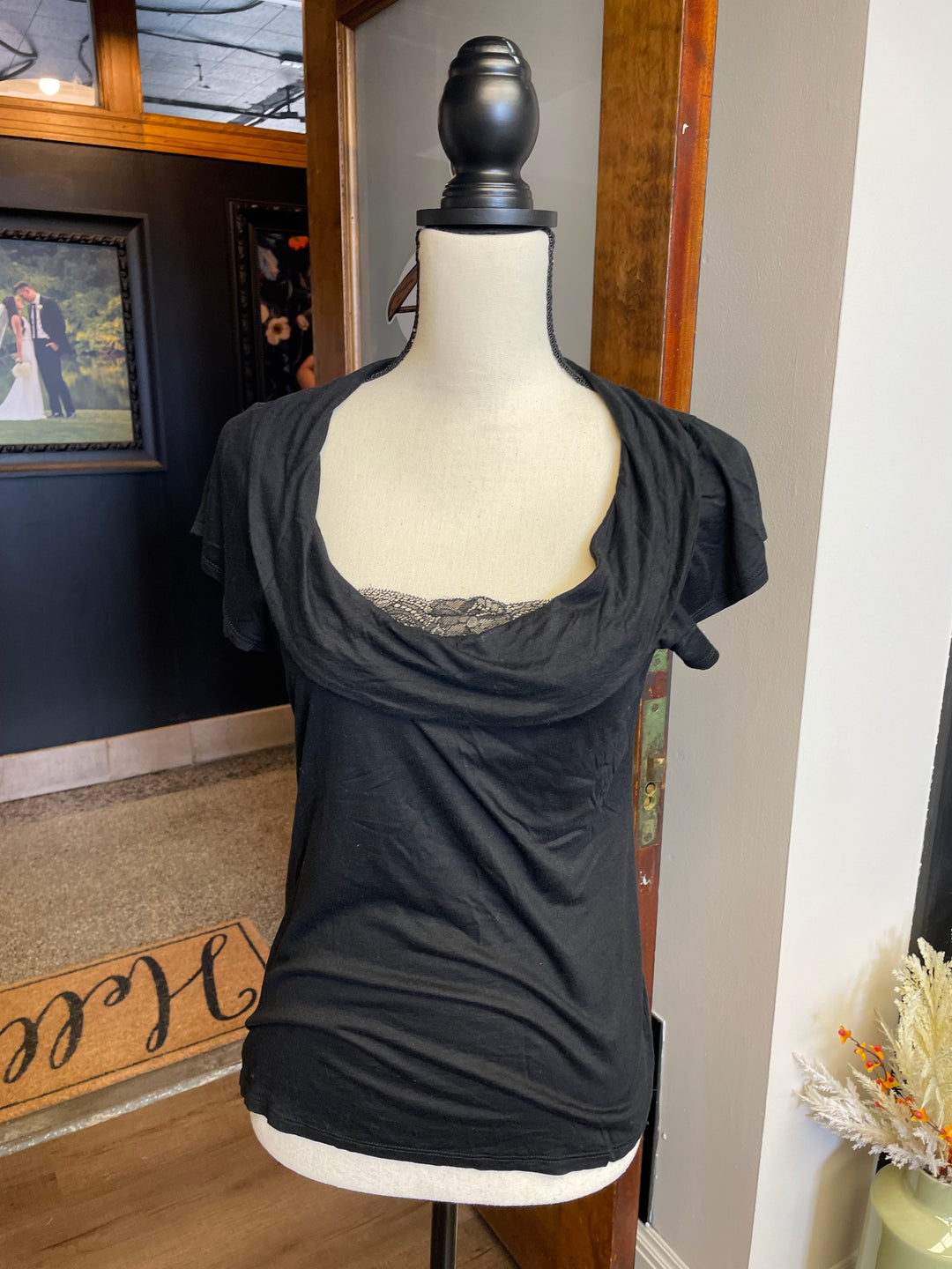Discover the perfect blend of comfort and style with this Banana Republic swoop neck lace-lined black tee. Crafted from soft, high-quality fabric, this tee features a trendy design and delicate lace detailing. Perfect for any casual outing, this tee will elevate your wardrobe to the next level. Previously loved, in great condition. Women's size medium.