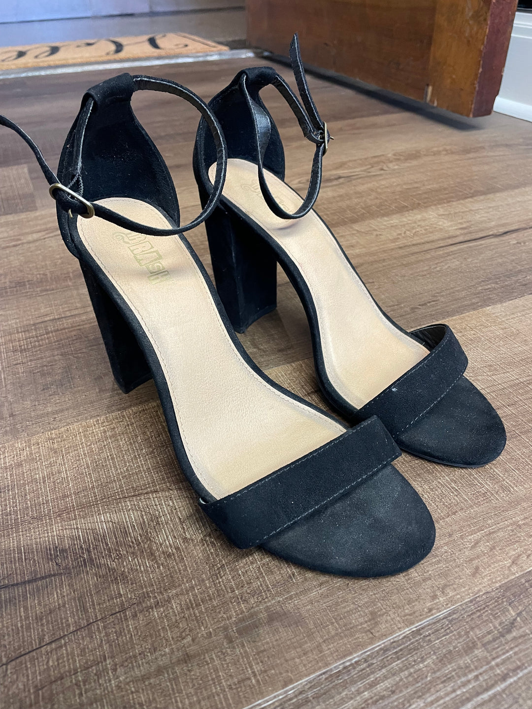Get ready to strut your stuff in these playful Brash black faux suede ankle strap block women's heels! With a 4.25" heel and ankle strap for extra support, these heels will elevate any outfit. So go ahead and be a little brash, you deserve it! Previously loved, in good condition. Women's size 9.5.