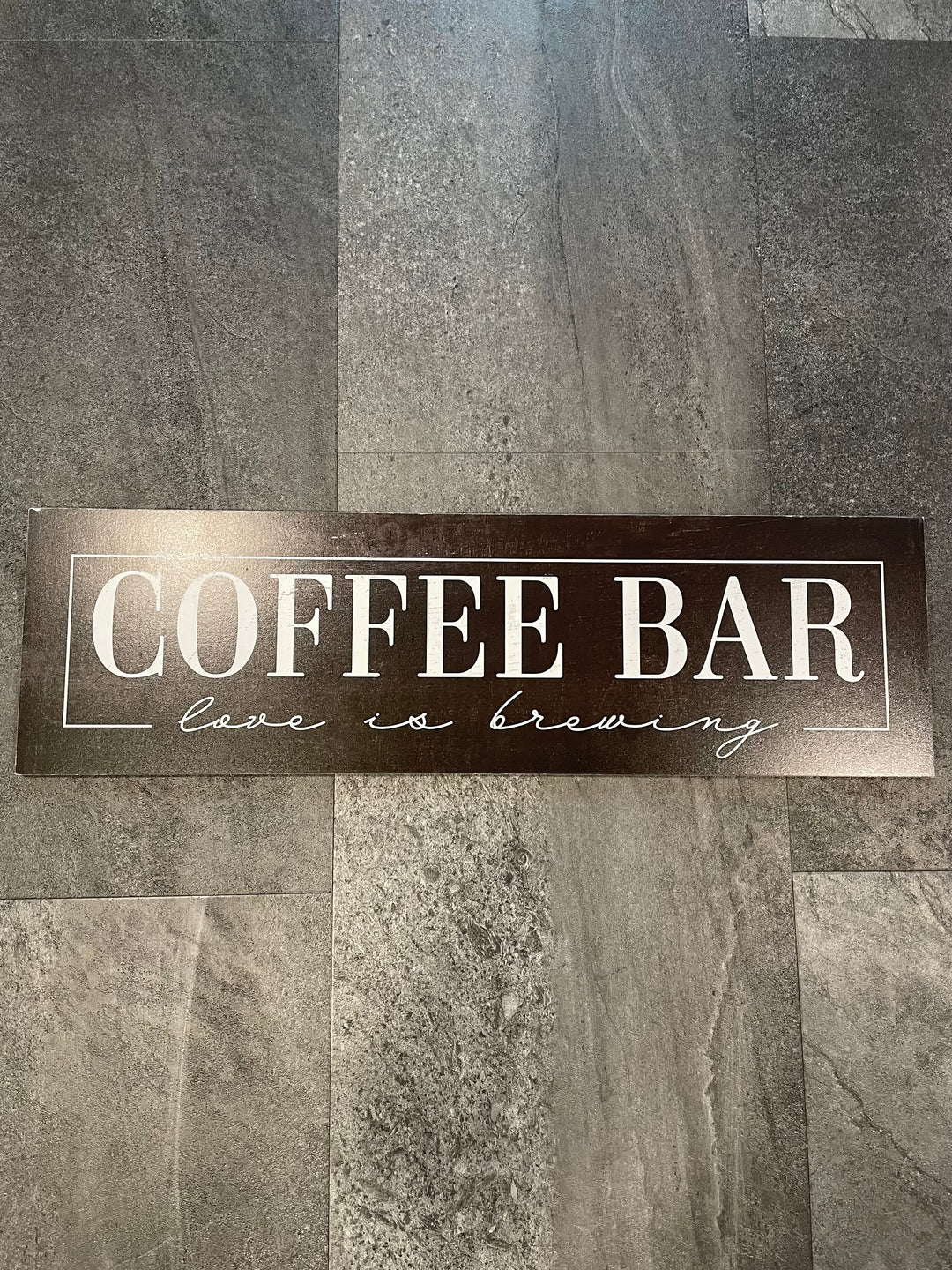 Add some caffeine charm to your home with this coffee bar wall sign. This fun sign is the perfect addition to any kitchen or coffee bar. Show off your love for coffee in a playful way. Ready to be hung on the wall. This piece is previously loved but was not hung on the wall - the protectors are still secured over the hooks. This piece measures 24" wide by 7" tall.