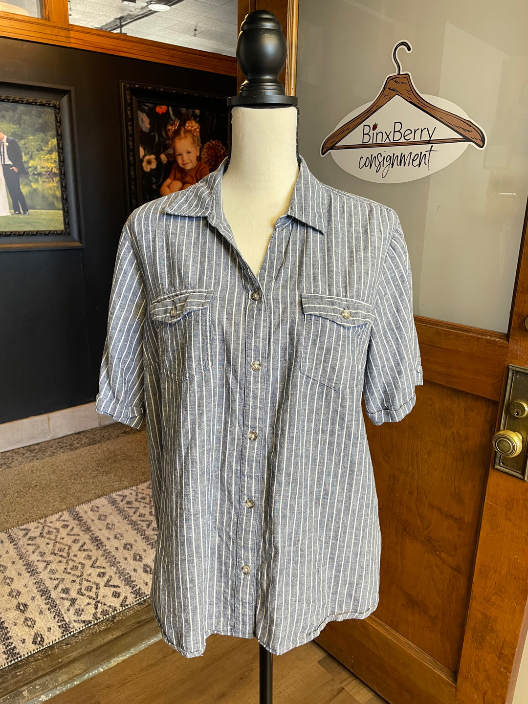 This short sleeved linen blend button down shirt from Croft & Barrow is perfect for any occasion. The color is a deep denim navy color with white stipes. Sleeves are slightly cuffed. Slight V-neck before the button down starts in the front.