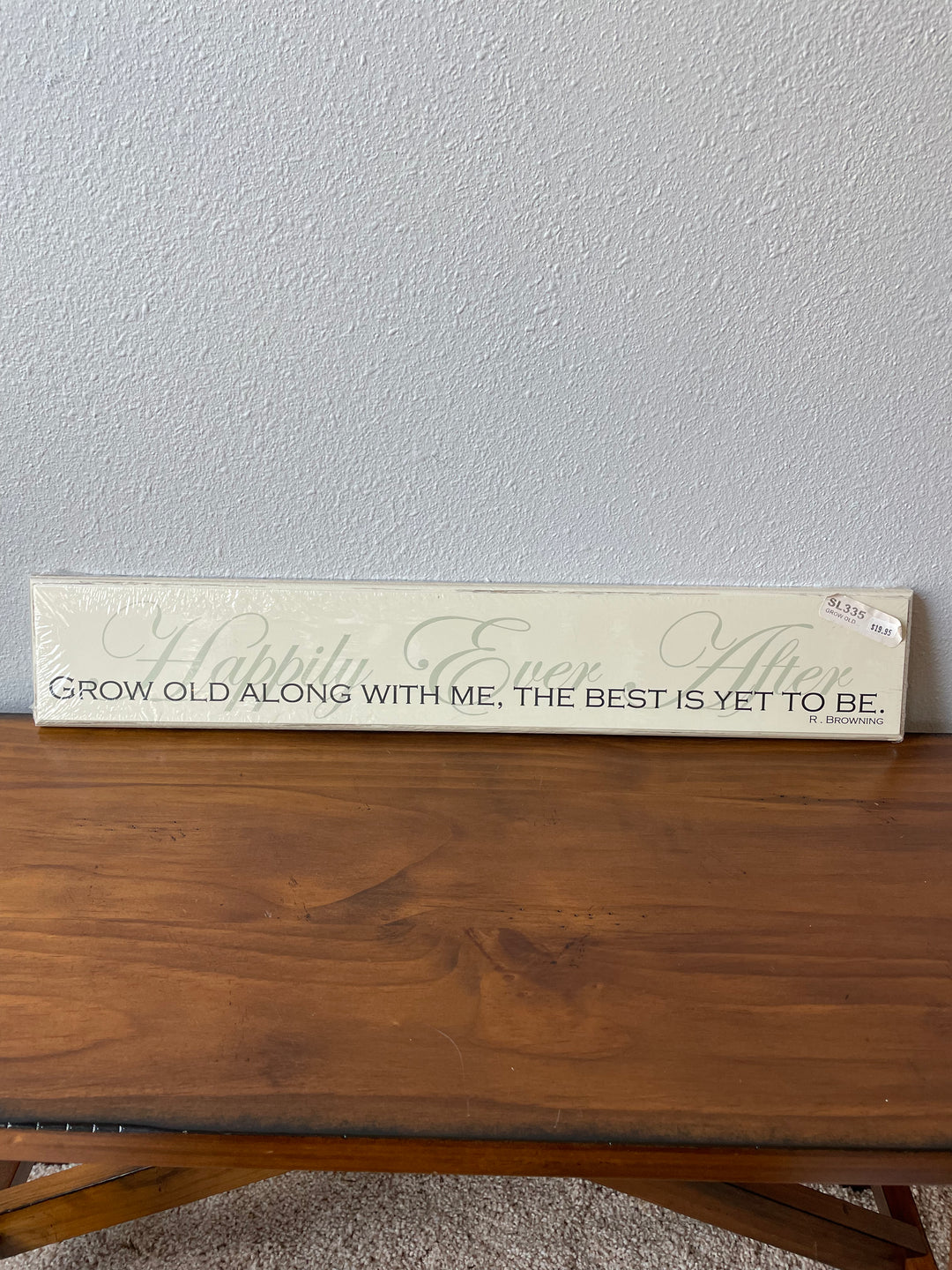 This wood plaque is brand new, in the original packaging. Can be hung or used on the tabletop. Measures 23" x 4".