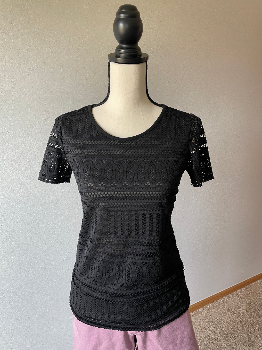 This black lace top has a mesh lining and slightly extended back hem. There is no size tag but we think this is women's size small.