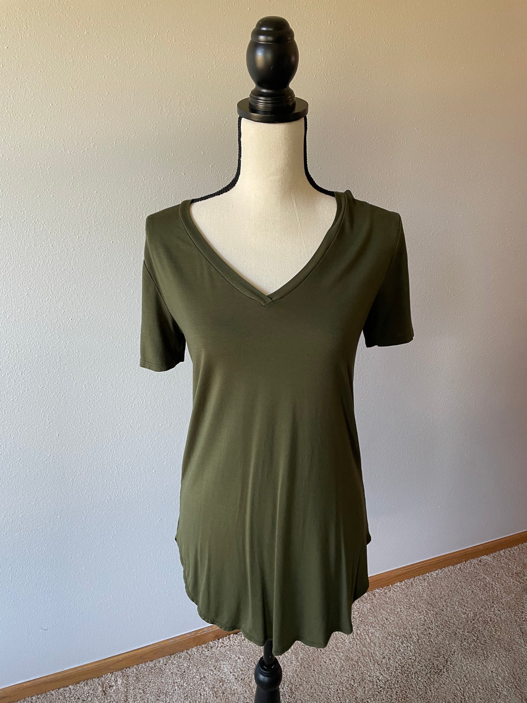 This V-neck top with extended back hem is buttery soft and oh so comfortable. Previously loved, in great condition, women's size small.