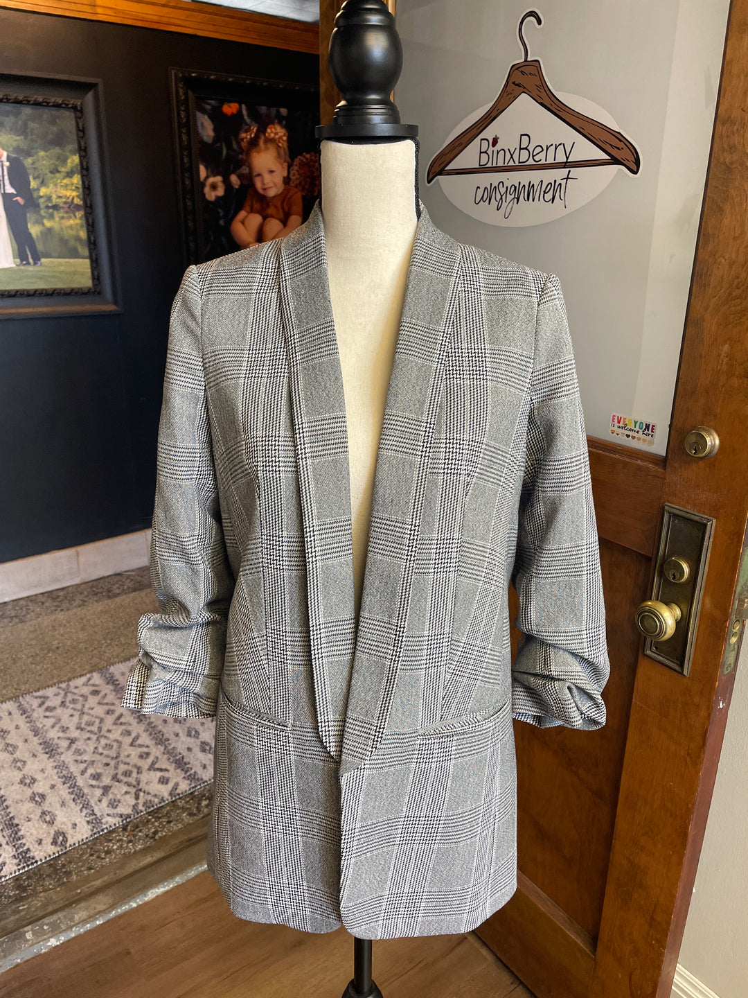 Step into style with this plaid women's blazer from Express. This chic blazer adds a splash of classic plaid charm to any outfit, perfect for turning heads at work or play. This blazer has an open front and gathered arms for a super cute, casual style. Two hand pockets and pink lining. There are built in shoulder pads.