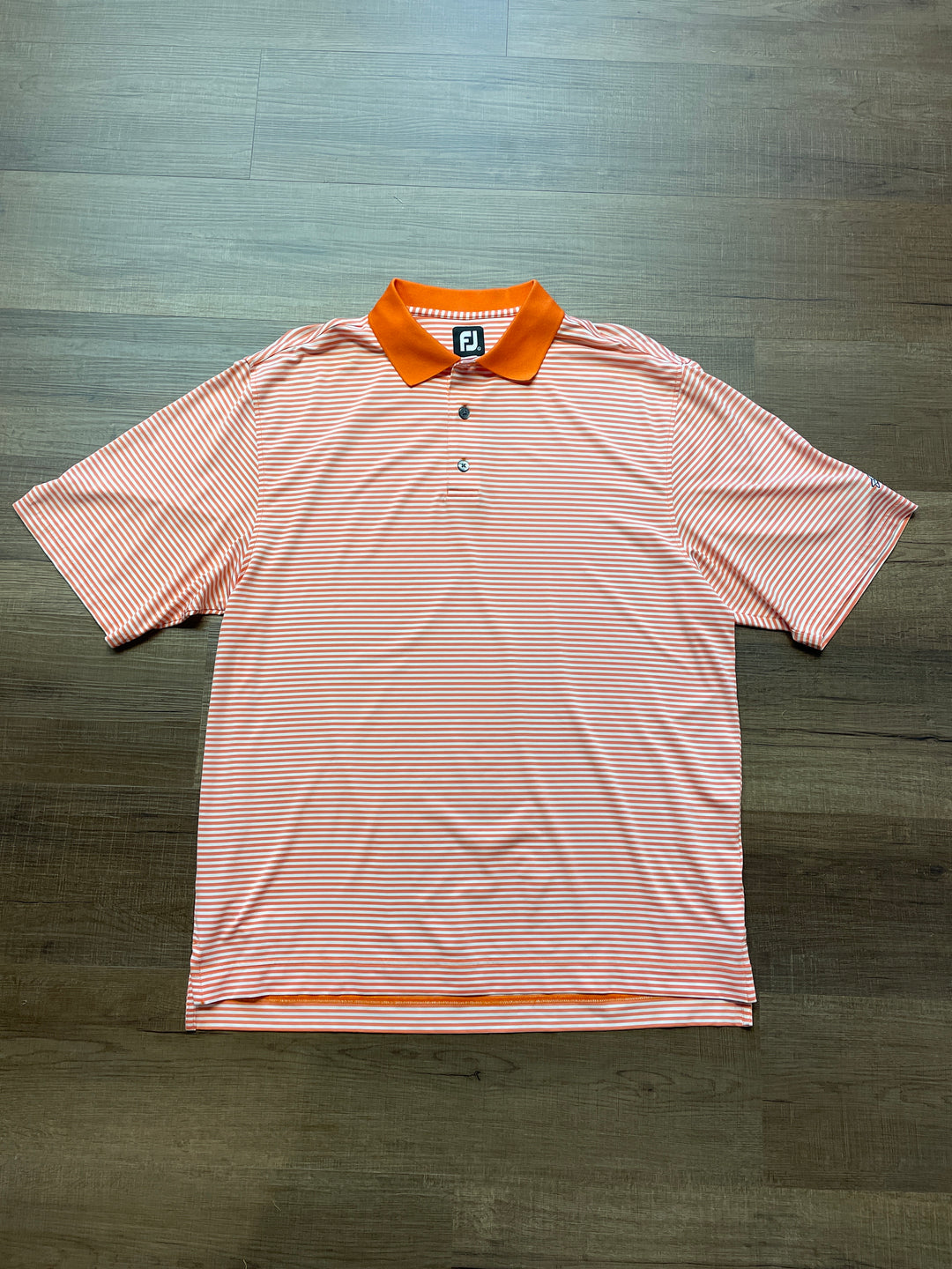 This shirt has a three button neckline, collar and is white with orange stripes.