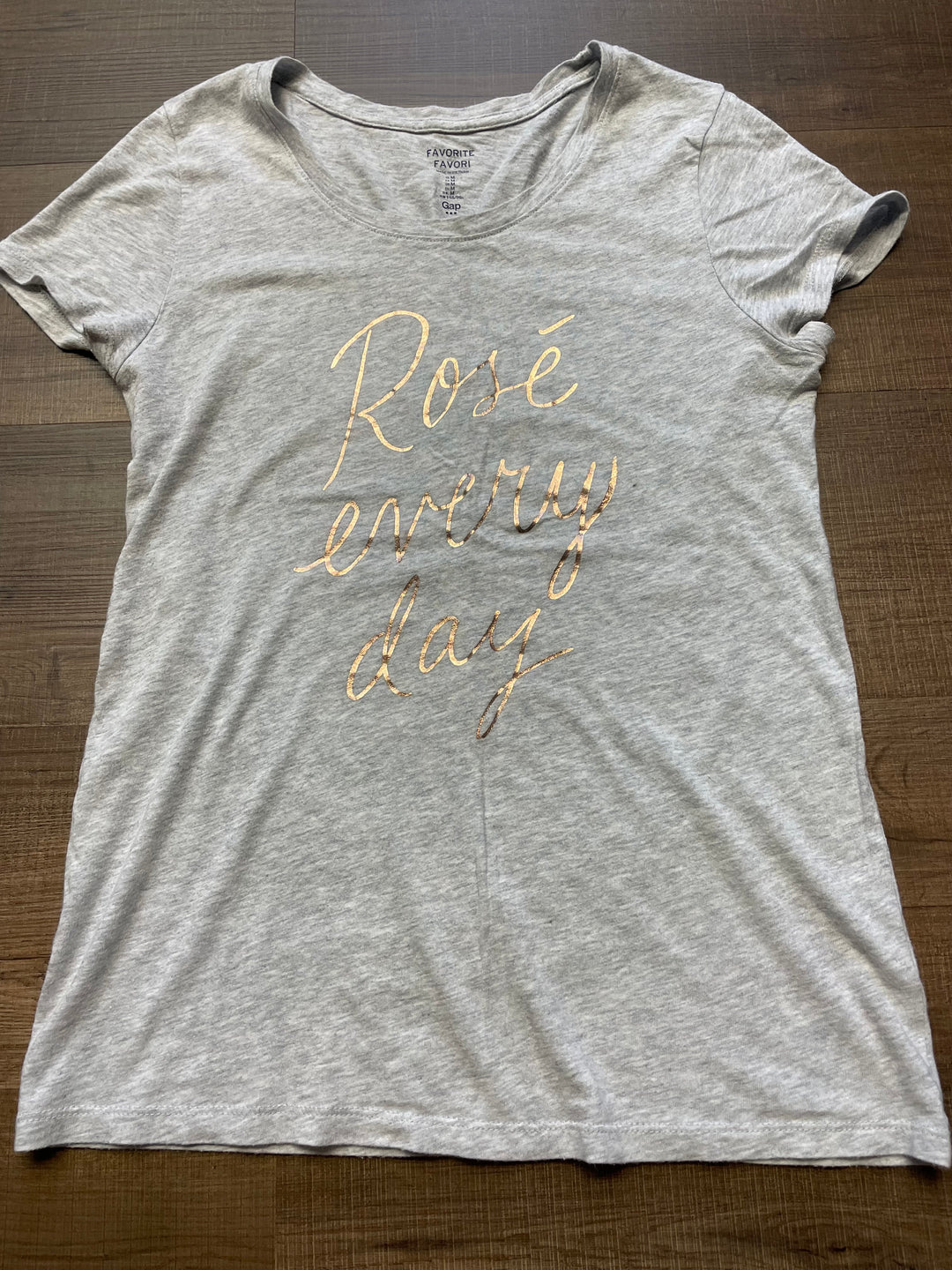 This GAP Favorite Tee is a stylish and comfortable choice for any day. Made with a high-quality cotton/modal blend, this tee features the fun and trendy phrase "Rose Every Day" printed in rose gold that is sure to make a statement. Perfect for any casual occasion. Previously loved, in good condition. Women's size medium.