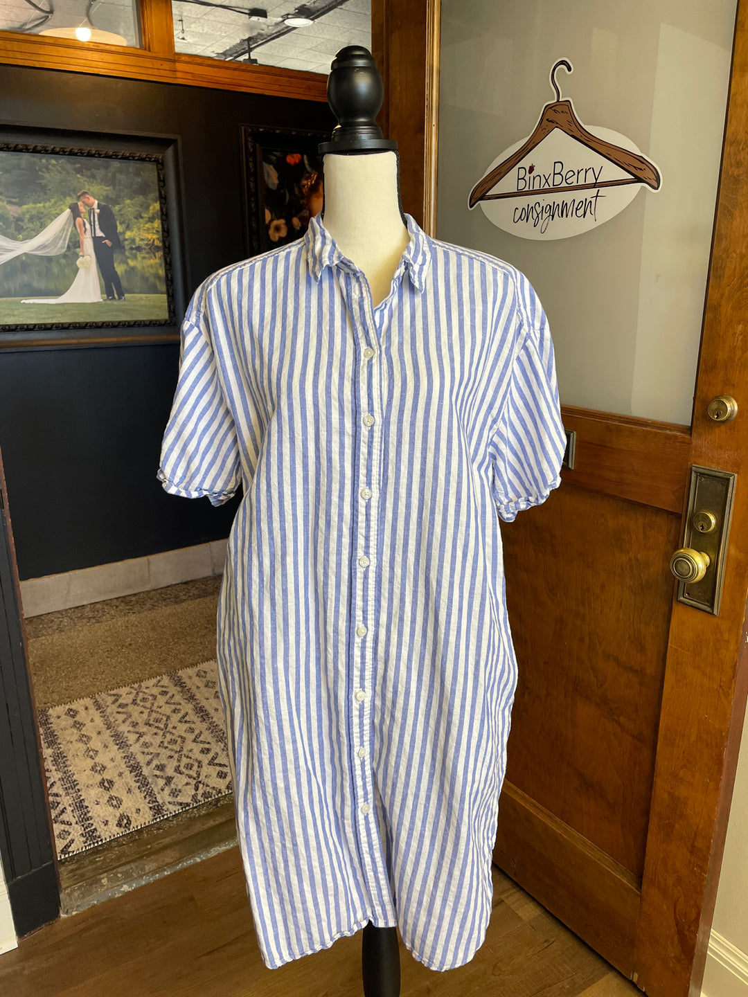 This full button down pinstripe shirt from GAP features a classic pinstripe pattern and a comfortable fit. Perfect for any occasion, you'll love the playful touch this dress adds to your look. This dress has pockets and slightly cuffed sleeves!!