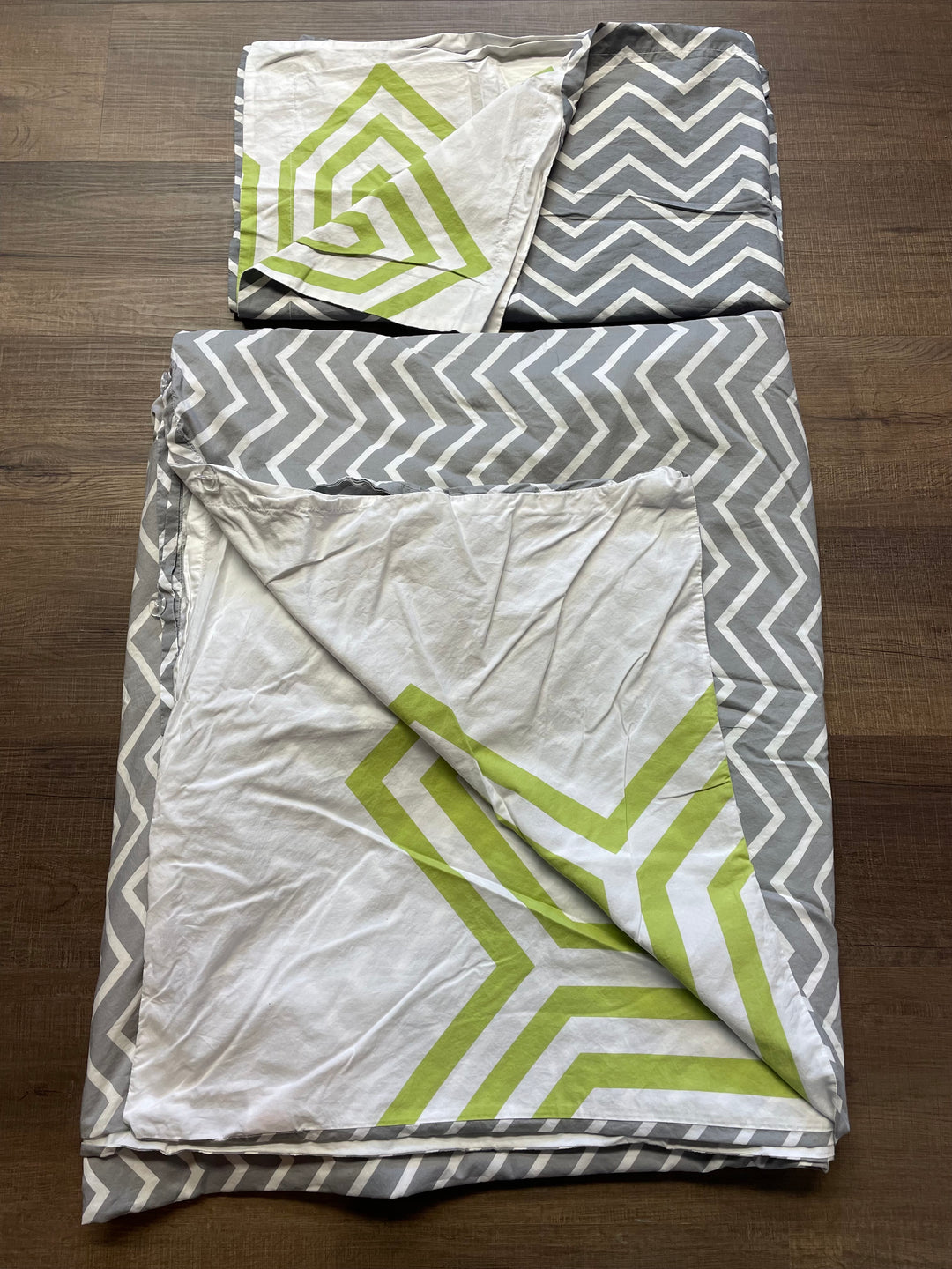 Elevate your bedroom with this Happy Chic by Jonathan Adler reversible duvet set. Featuring a playful and colorful reversible design, this set includes a king size duvet and matching pillow shams. One side of this set is a bold and bright green with geometric detail in white; the other size is grey and white chevron. Add a touch of quirk and humor to your bedroom decor with this set. Measures 90in x 104in. 100% cotton. Sold as a set.