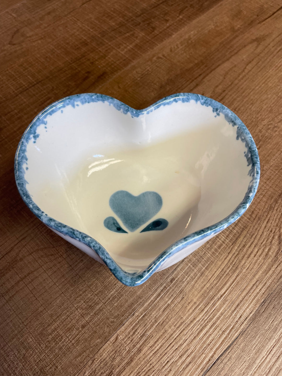 Add some heart to your space with this painted ceramic bowl! This unique dish is perfect for holding your favorite baubles or as a cheerful decoration. Get one for yourself or gift it to a friend to show them some love! Measures about 6.5" wide x 5" tall. Previously loved, in great condition.