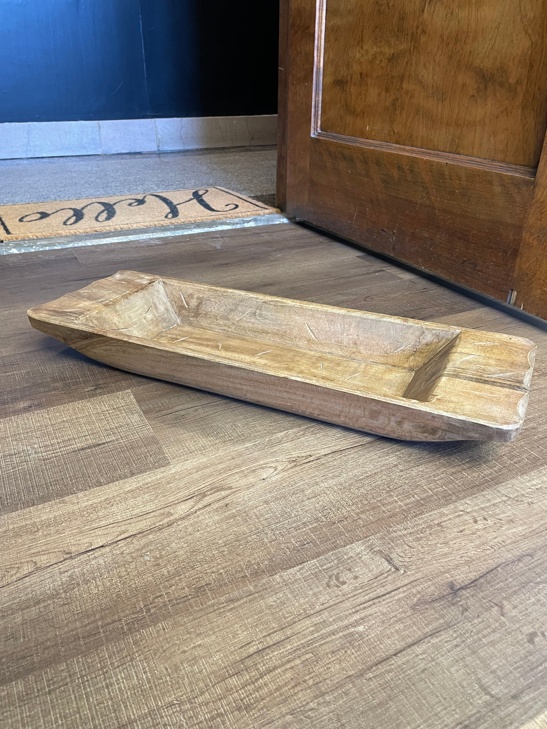 This J.C. and Rollie country handcrafted dough bowl is inspired by traditional craftsmanship. Handcrafted from the finest wood, this bowl is perfect for kneading dough or using as a centerpiece in your decor. Add a touch of rustic charm to your home and impress your guests. This piece measures 26in long x 9in wide x 3in tall. Previously loved, in great condition. There is one flaw in the wood that isn't noticeable nor will it impact function of the bowl. It was likely there when the bowl was purchased new. Disclosing for transparency.