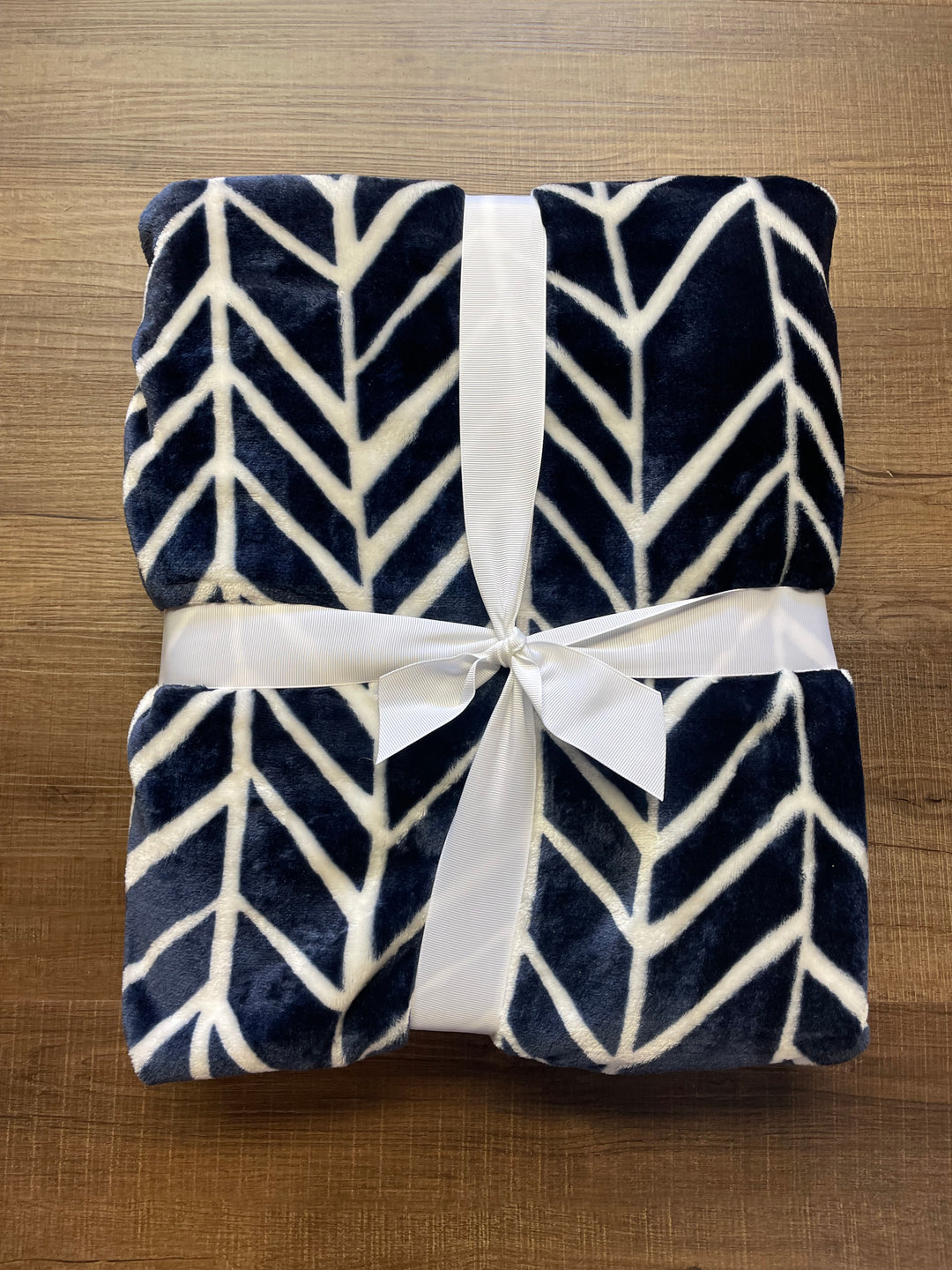 This is a navy blanket with white print detail. Brand new, with tag. Still has the cardboard insert so it will keep it's shape.