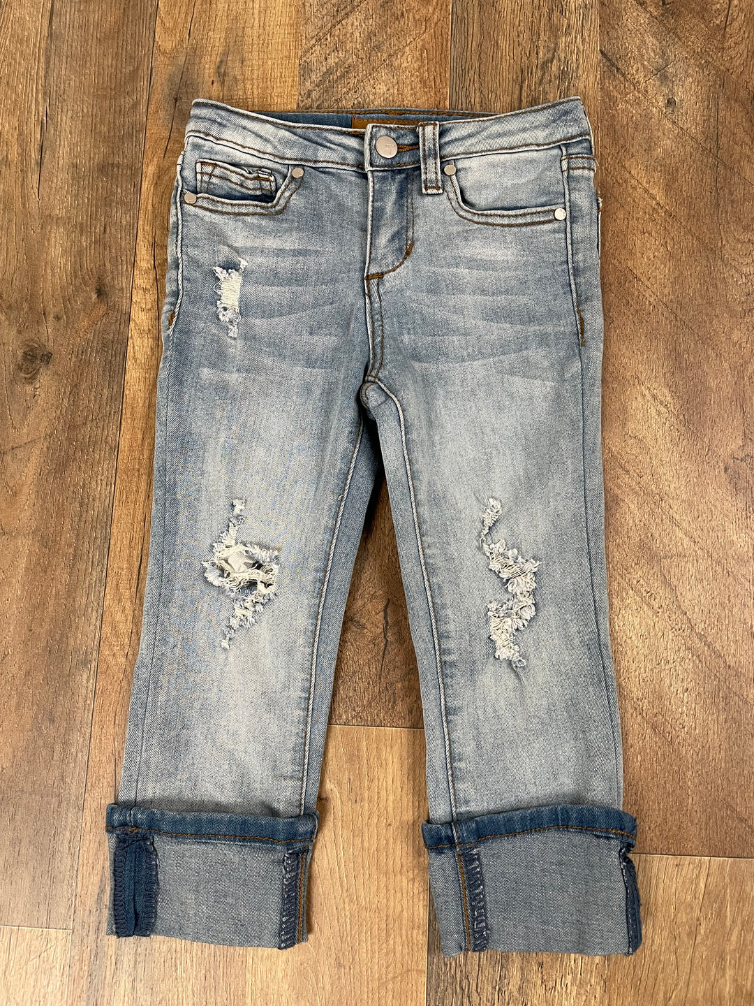Adorable cuffed jeans designed for active girls. These Joe's jeans feature a classic five-pocket construction with a comfortable fit perfect for everyday wear. The rolled cuffs add a playful, trendy touch that kids love. Durable denim construction ensures these jeans withstand playtime and frequent washing. Ideal for pairing with sneakers, boots, or casual tops for a put-together look.