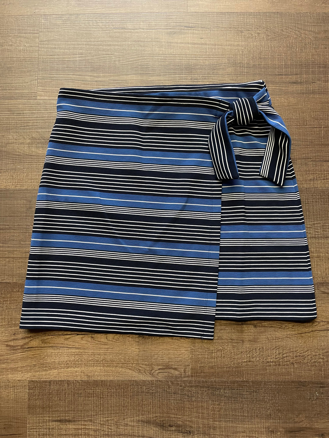The front panel of this skirt raps around and ties on the left hip. Elastic waist with stretchy material. Slip-on style.