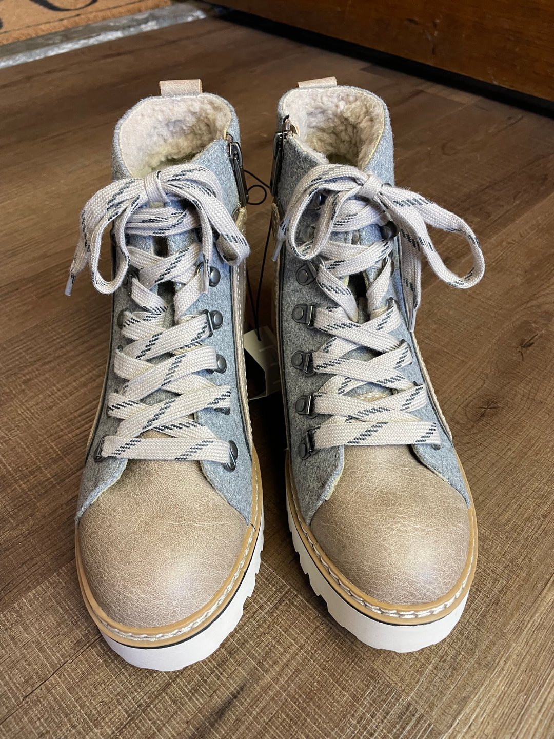 These are beige faux leather and gray felt, highlighted with gray and beige laces and silver matte grommets. There is also a zipper on the inside of each ankle.