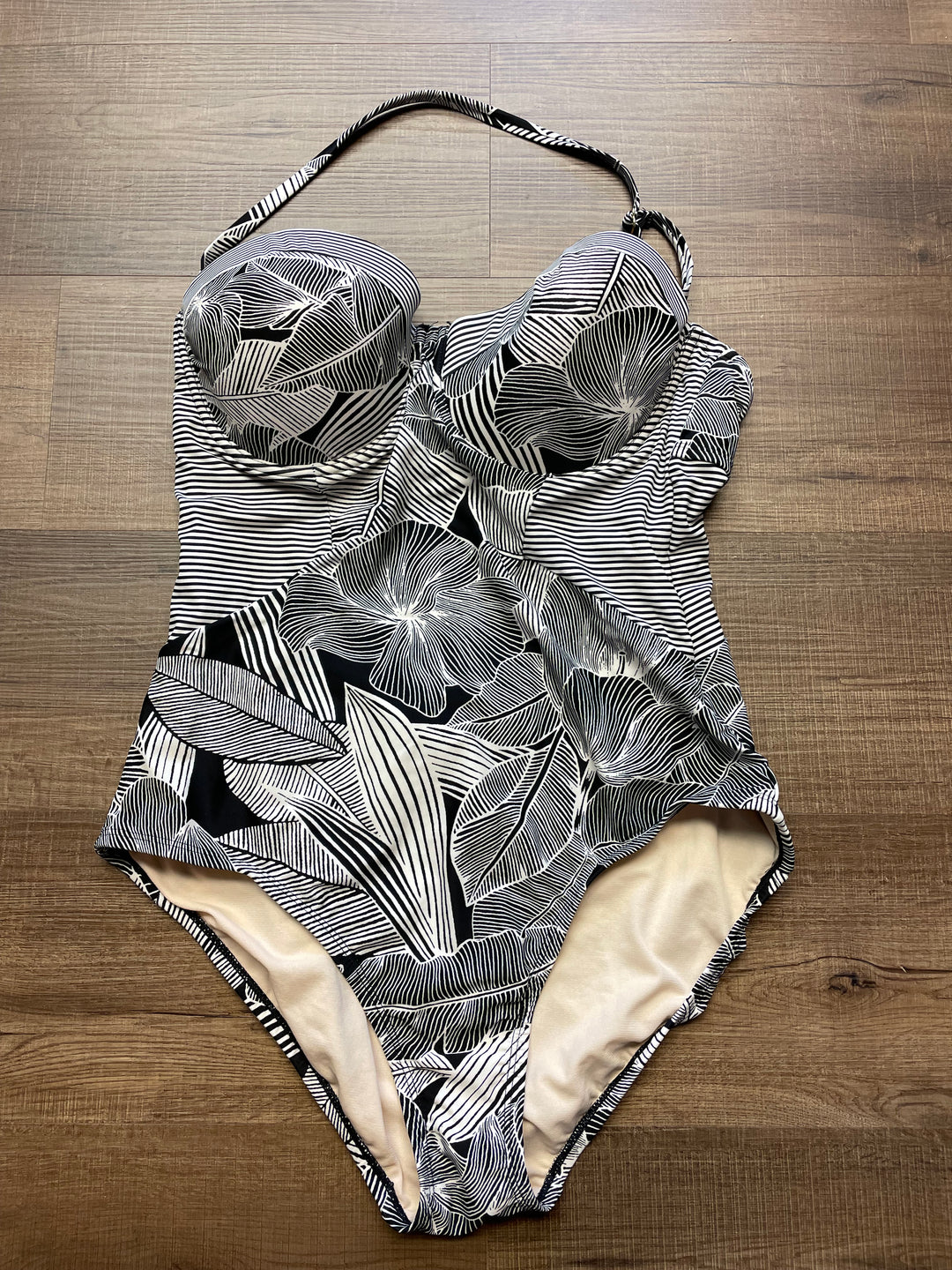 Look good and feel comfortable in this Merona one piece convertible swimsuit! With a removable (and adjustable!) behind the neck strap and underwire cups, this swimsuit is both versatile and supportive. Wear it strapless or with the strap for more support, this black and white tropical print is super stylish. There is an additional hook closure in the back.
