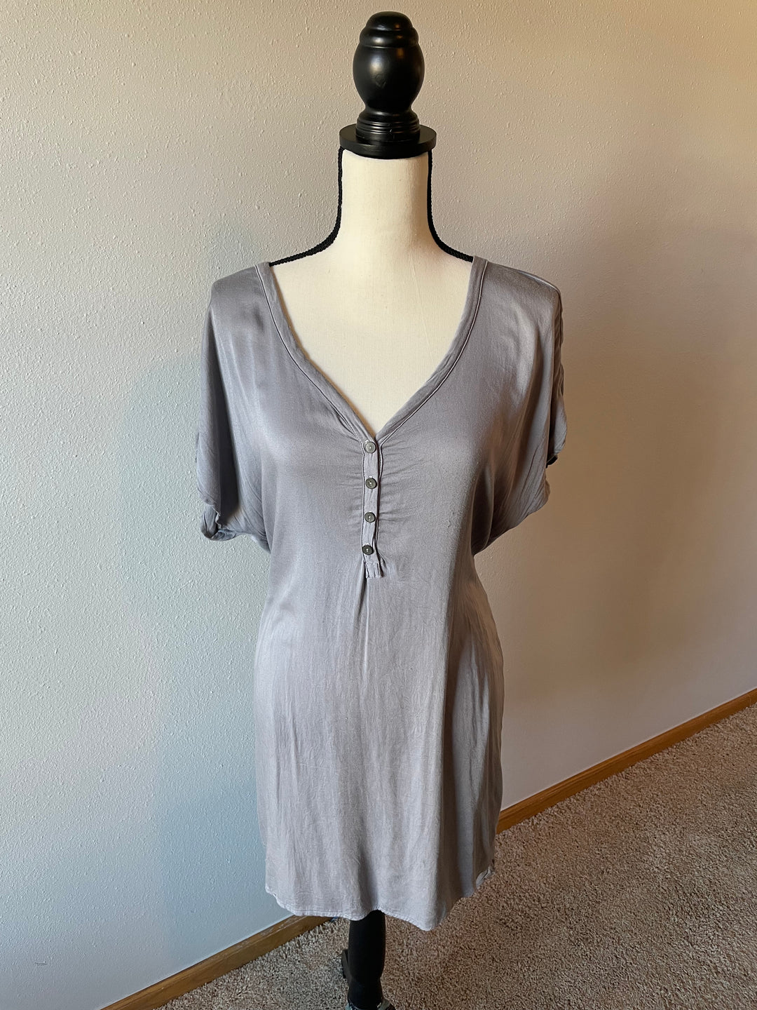 This V-neck t-shirt dress is oh-so-soft and comfortable. Lightweight and roomy, it's given some structure with four buttons on the V-neck and an adorable tie detail in the back. Material is rayon/spandex mix. This dress would look so cute with some boots or booties. Previously loved, in great condition. Women's size small.
