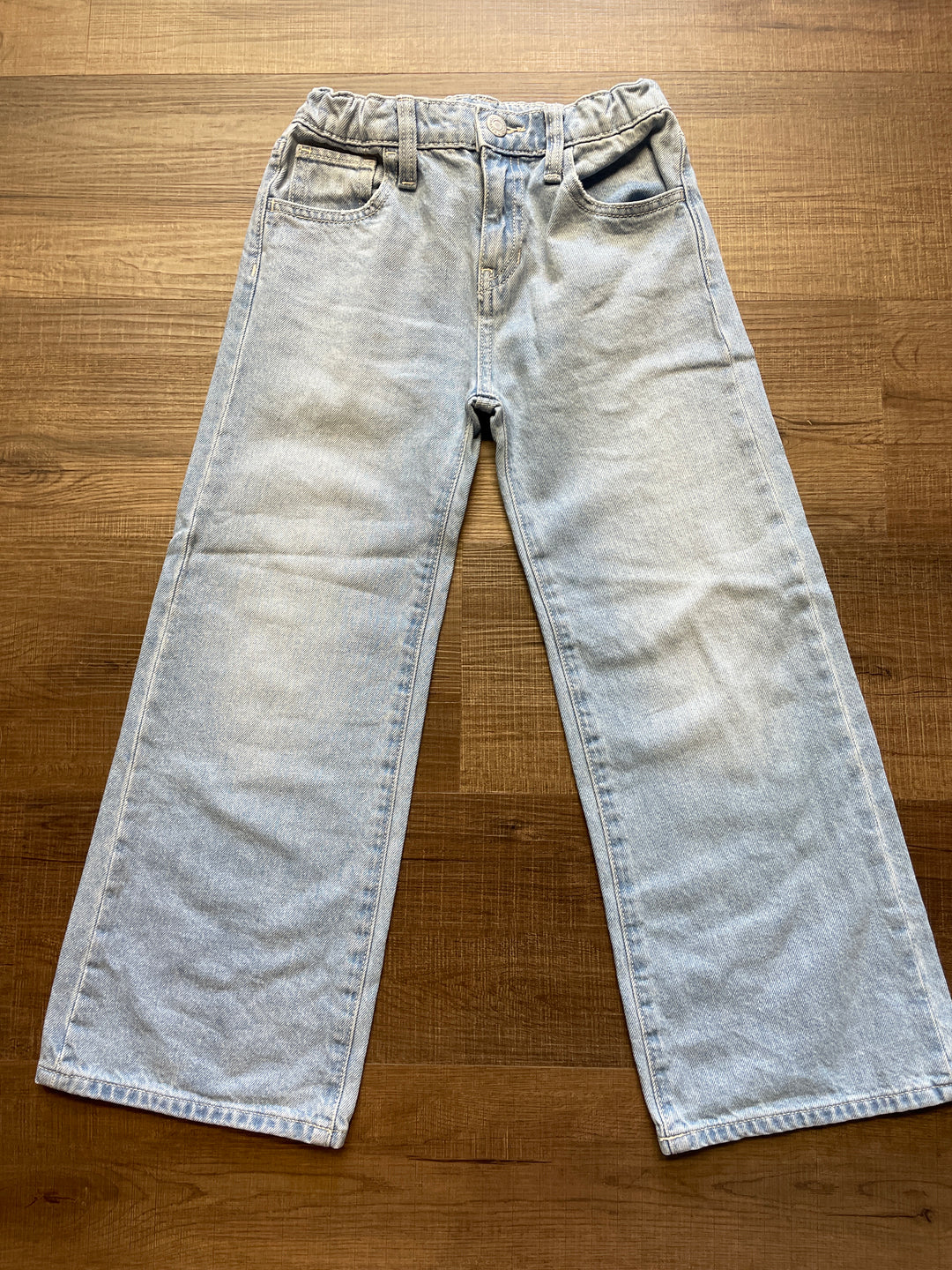 Adjustable waist. Zipper fly with snap closure at the waist. Classic five-pocket design. Previously loved, in good condition. Children's size 8 with a 21" inseam. Leg is 8.5" wide.