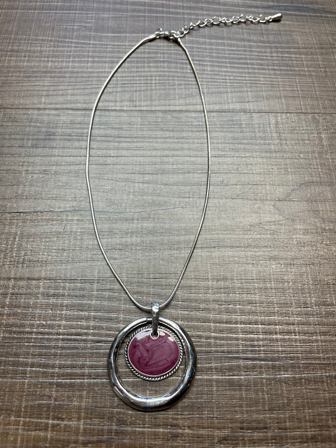 This pretty silver plated snake necklace with pink pendant is the perfect accessory. Landing beautifully on the collar bone, it measures 15" in length and is fully adjustable with a lobster clasp. Previously loved, in good condition.