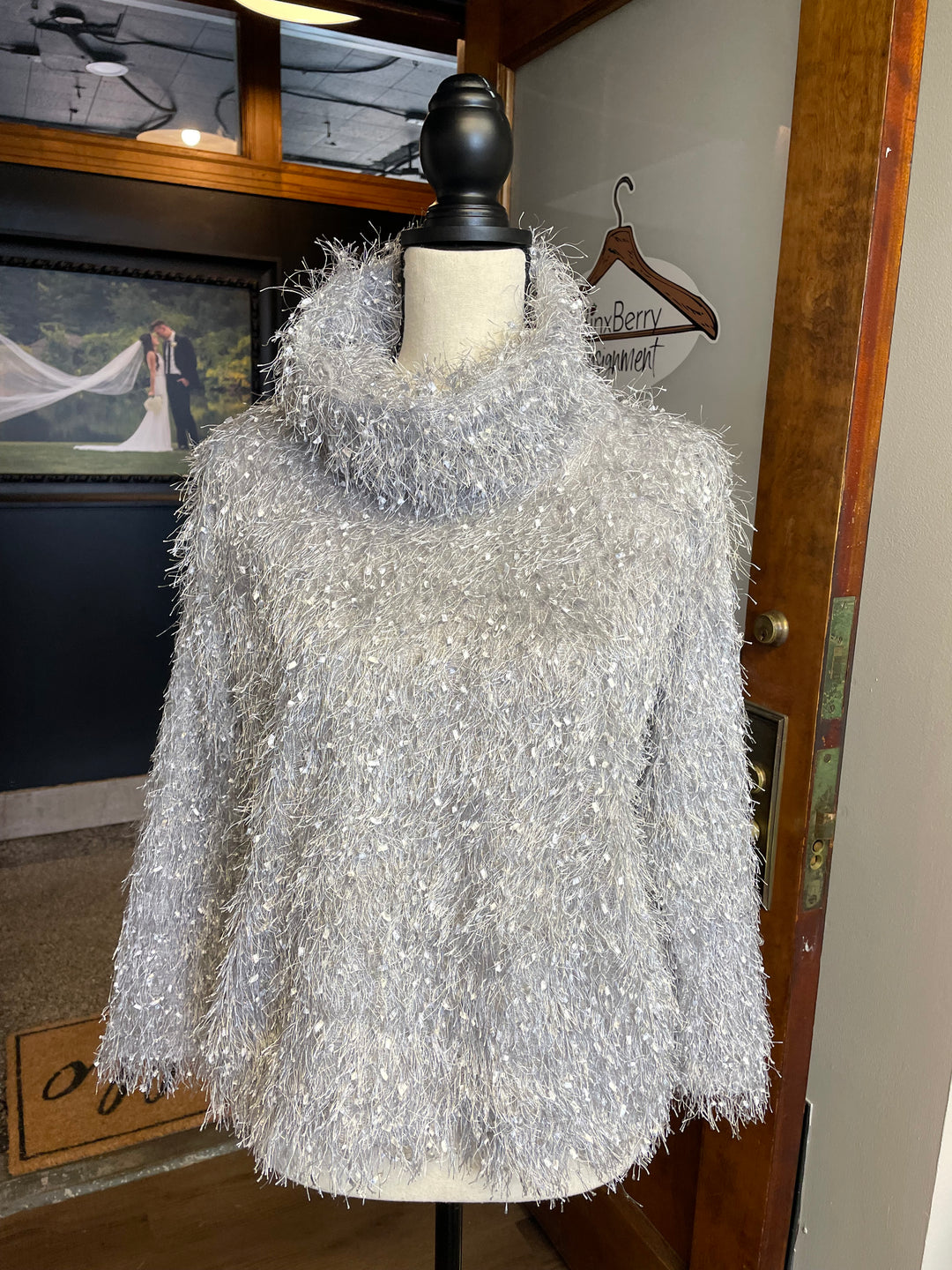 Reach new fashion heights with this Skye's the Limit silver eyelash cowlneck top! This chic top features a unique cowlneck design and elegant silver eyelash detailing that will make you stand out from the crowd. Perfect for any occasion, this top will elevate any outfit with its stylish and playful touch. 100% polyester. Previously loved, in great condition. Women's size petite small.