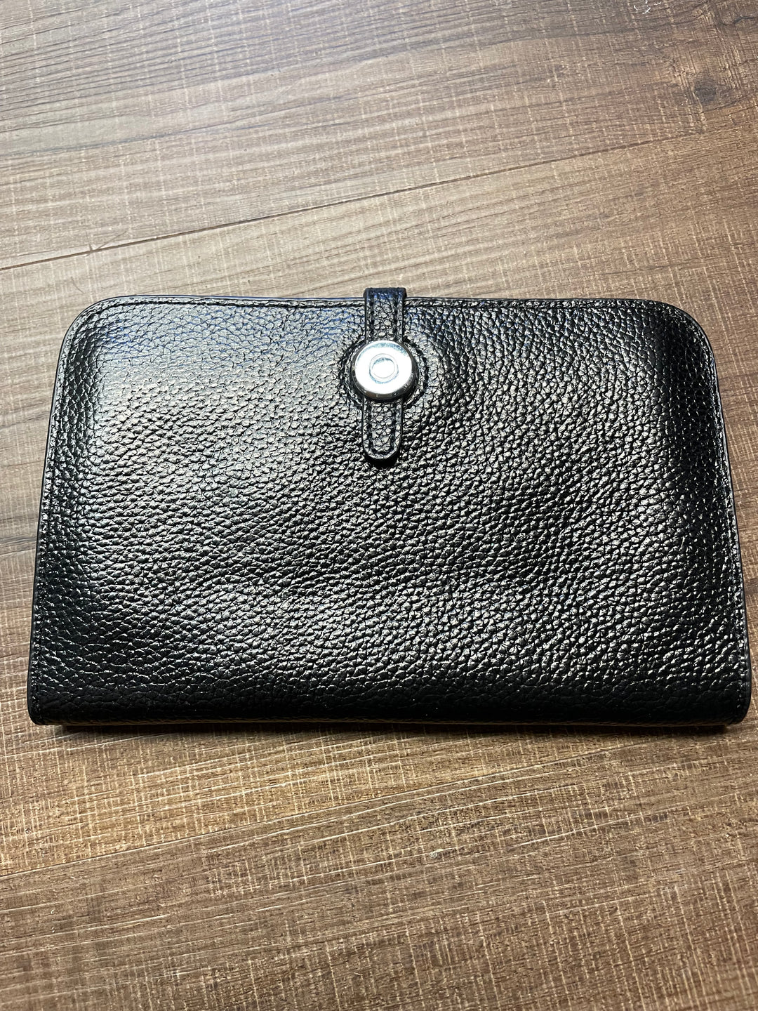Keep your cash and cards securely stashed away with this soft leather folded wallet. Its supple leather and clever design make for a sleek and organized way to carry your essentials. This wallet features three credit card slots and a zipper compartment for coins or essentials. Previously loved, in great condition. Can't confirm this is genuine leather, it's likely a synthetic/faux leather. Measures 7.5in wide by 5in tall.