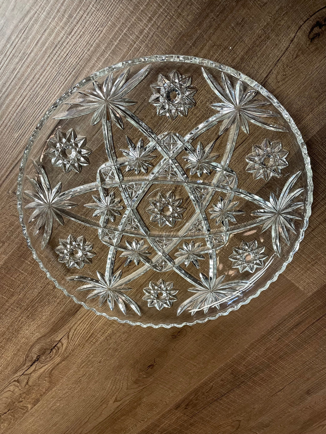 Add a touch of vintage charm to your dining spread with this Star of David glass serving plate. This 13.5" crystal plate is perfect for serving up your favorite dishes. Previously loved, in great condition. Perfect for the season.