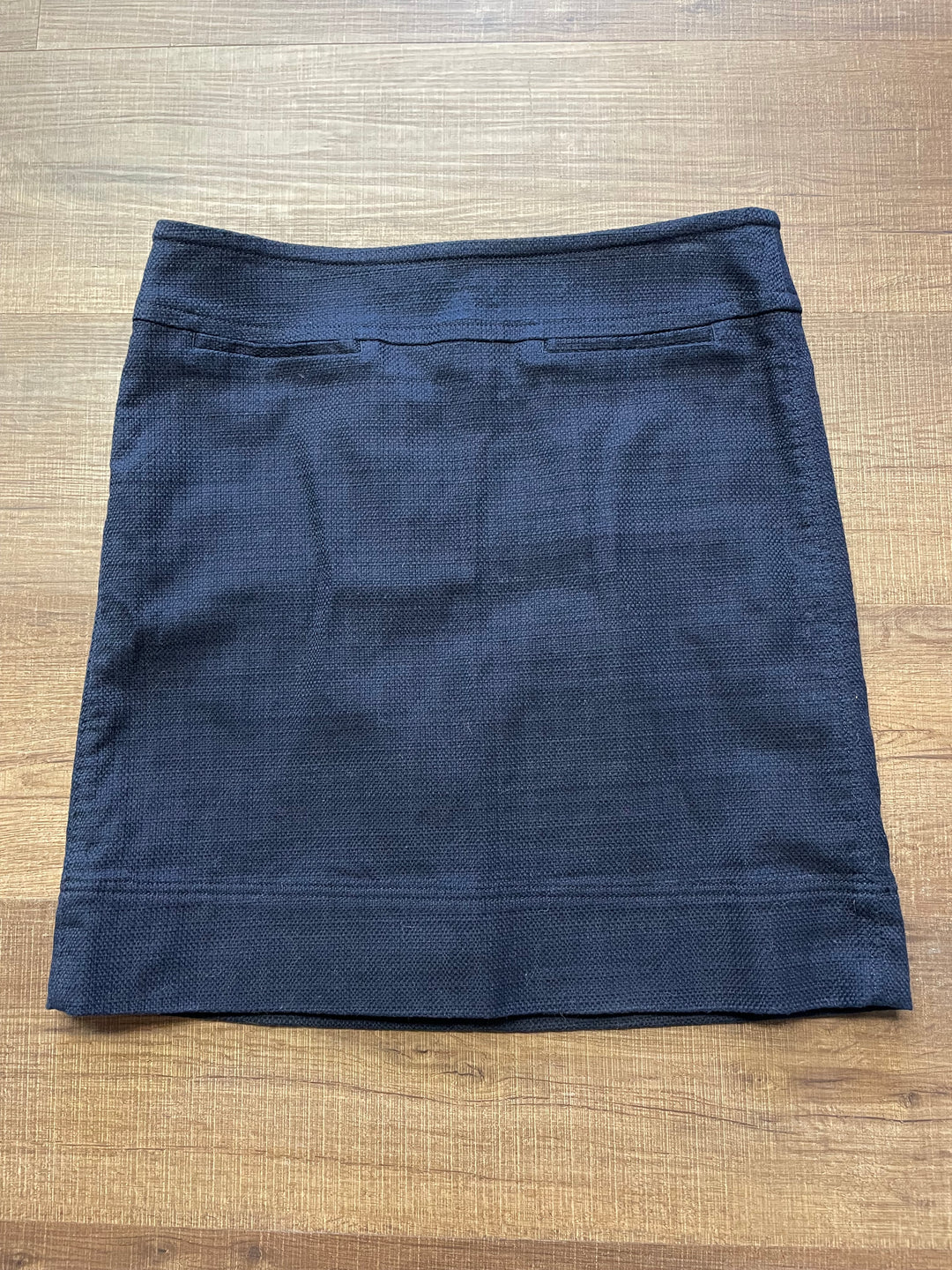 This navy blue tweed skirt by Talbots is a must-have. The classic silhouette and luxurious fabric create a timeless look while the playful blue color adds a touch of fun and trendiness. Perfect for any occasion, this skirt will make you stand out from the crowd in style! The shell is a cotton/spandex blend, the lining is 100% polyester. Two front pockets are for style only; back zipper closure. Previously loved, in great condition. Women's size 6. The waist is 14.5" and the length is 18".