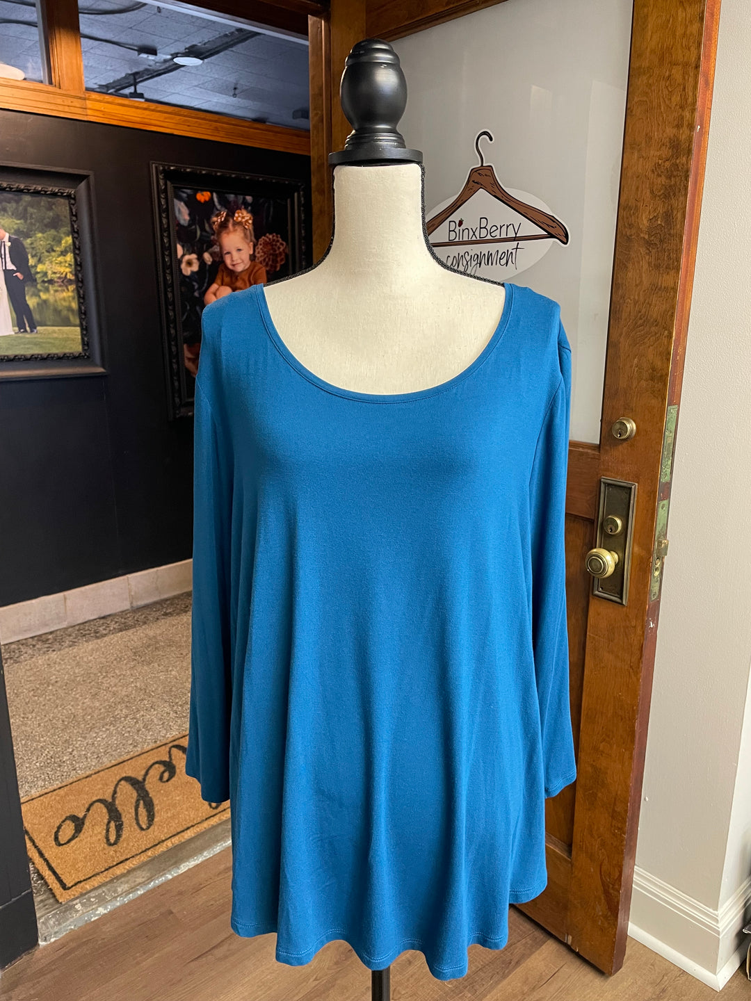 This top is comfortable and versatile. With a swoop neck and loose, flowing fit, this top can be dressed up or down. Material is 95% rayon, 5% spandex. This is a deep blue color. Very pretty! Previously loved, in great condition. Women's size 2X.