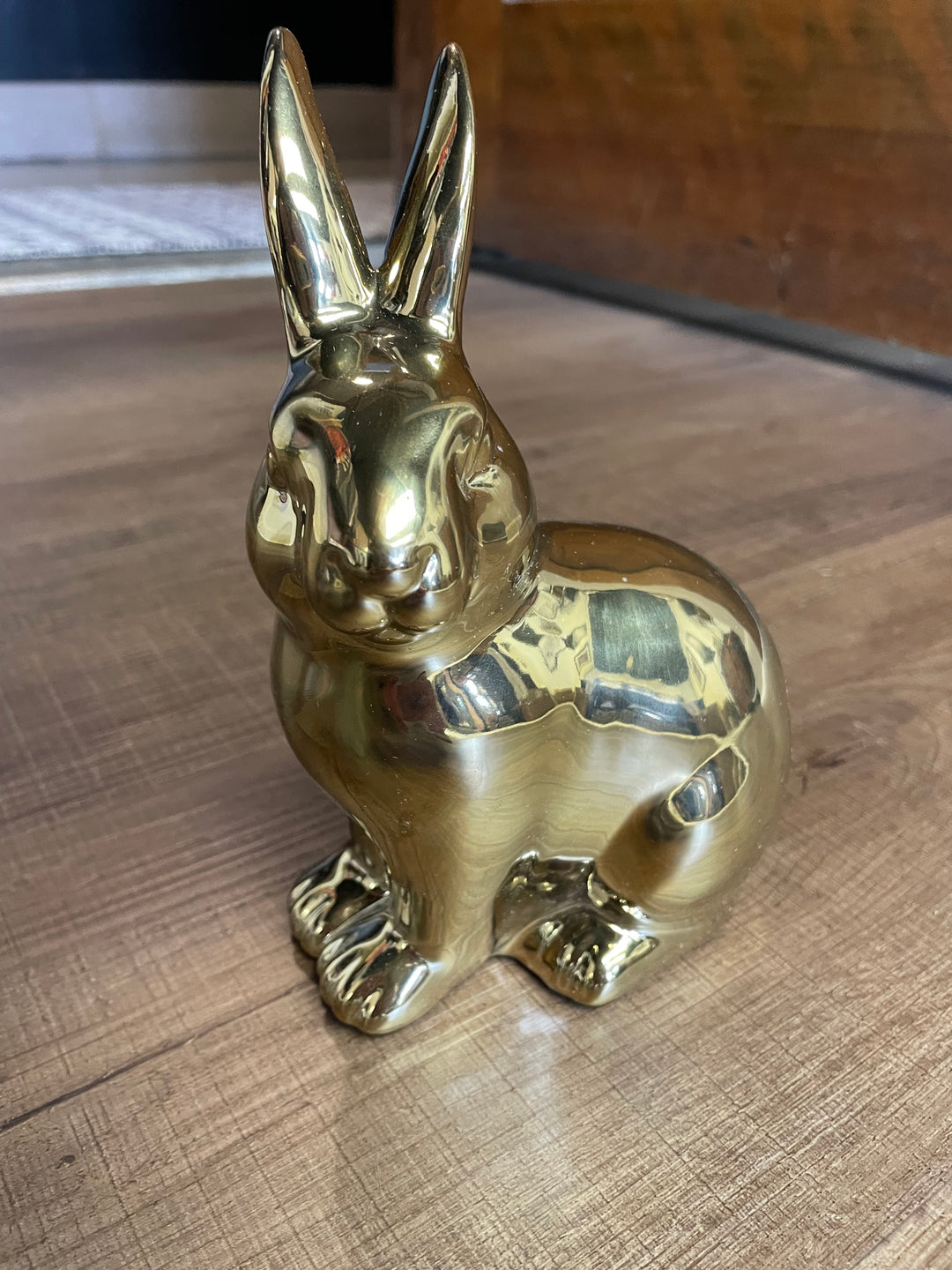 Add a touch of whimsy to your space with this gold painted stoneware bunny figurine from Threshold. This charming little bunny, depicted in a classic sitting position, brings playful elegance and a warm golden glow to any shelf or tabletop. Perfect for brightening up your home décor or gifting to a bunny lover!
