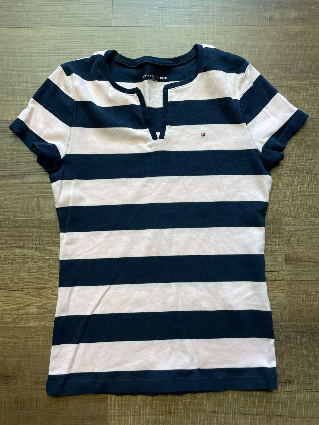 Add some fun flair to your casual wardrobe with this Tommy Hilfiger tee. This tee has a V shaped cutout at the neck. Pink and navy horizontal stripes complete the look. Crafted for comfort and cool vibes, this medium-sized shirt effortlessly pairs with your favorite jeans or shorts for a fresh, spirited look.