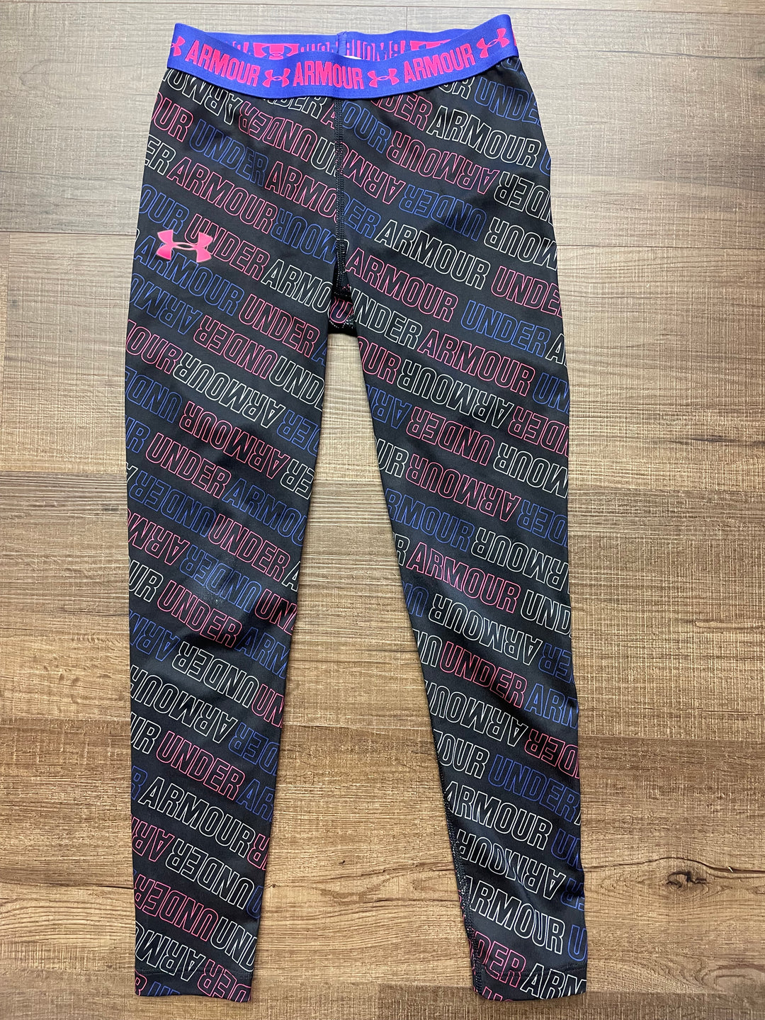 Your child will slay in these black Under Armour leggings. A comfortable and dry blend of polyester and elastane, they have a fun logo print style and a pop of purple at the waist! Perfect for a day at school, soccer practice or everyday wear. Previously loved, in great condition. Youth size small.