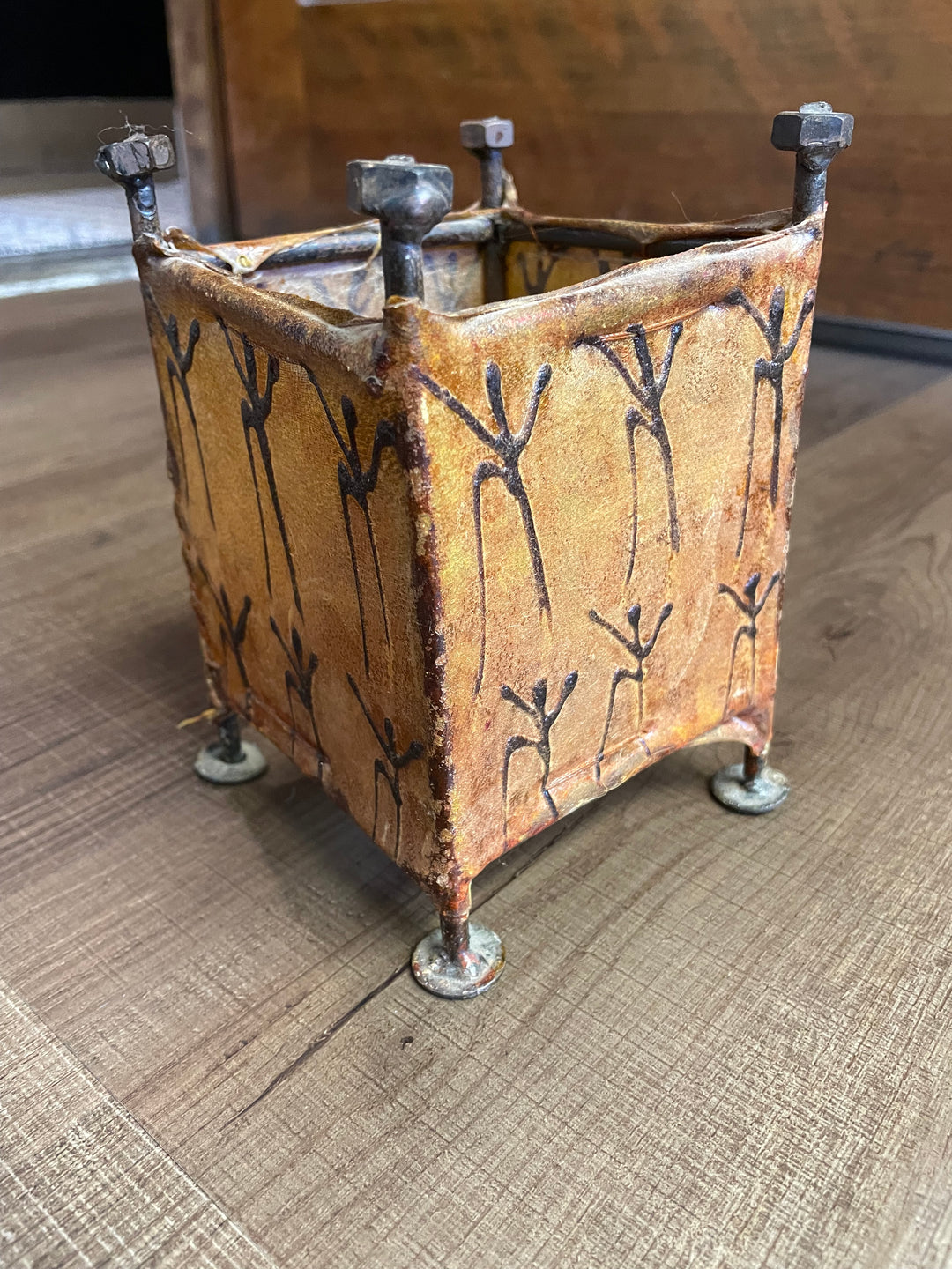 Measures 4" squared around and stands 6" tall with a metal base and feet.