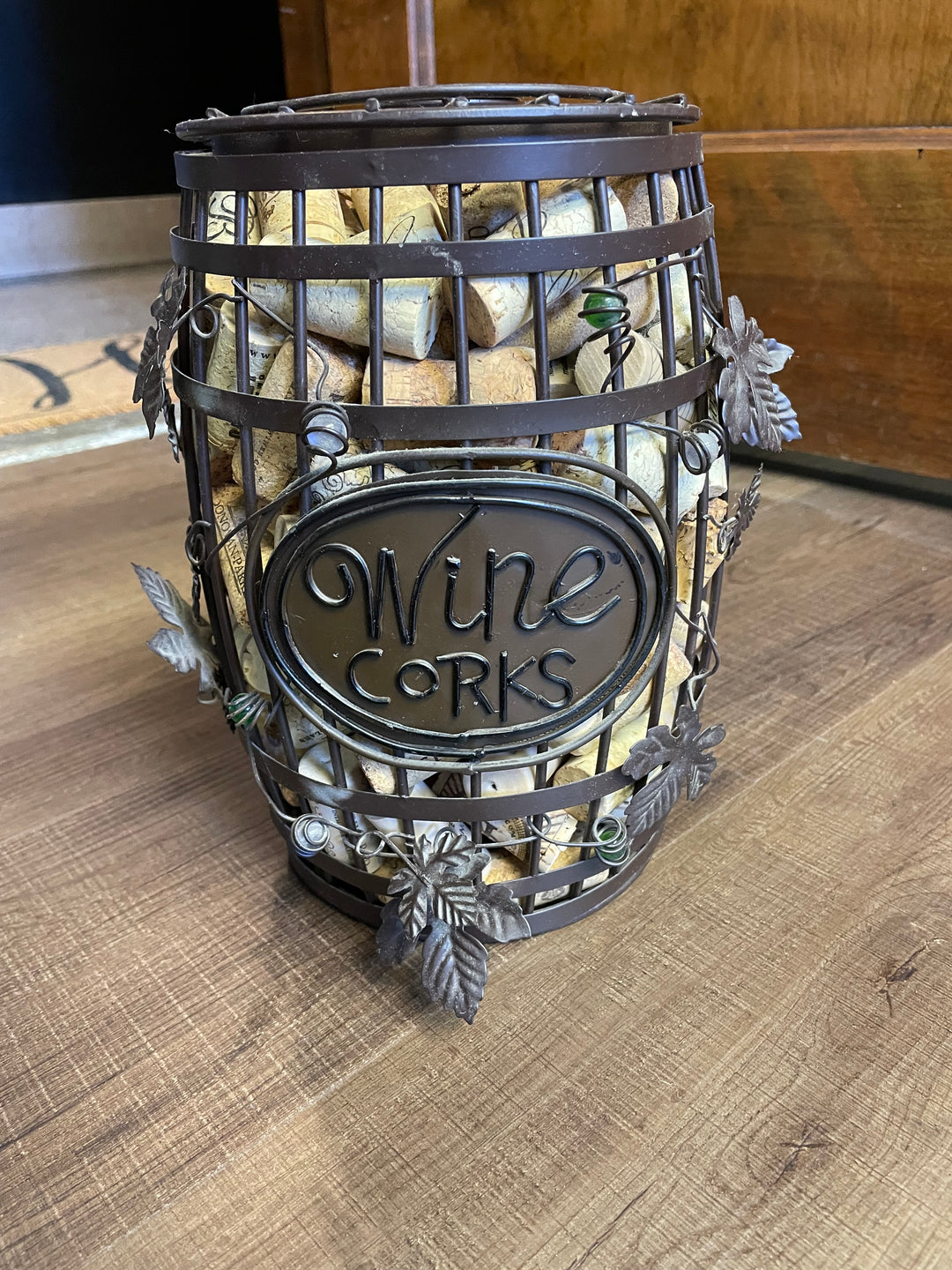 This wine cork holder is perfect for wine lovers and adds a unique touch to any kitchen or bar. Use the real wine corks that come with it, or fill it with your own! Previously loved, in good condition. Measures 9.5in tall and is 6in wide at the base.